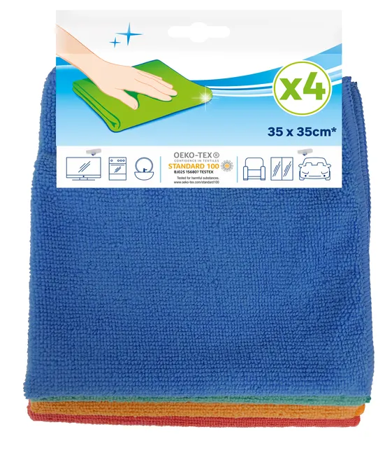 Zestaw 4 ściereczek z mikrofibry, idealnych do czyszczenia wszystkich powierzchni w domu. Etykieta OEKO-TEX® gwarantuje brak szkodliwych substancji w ilościach szkodliwych dla zdrowia.